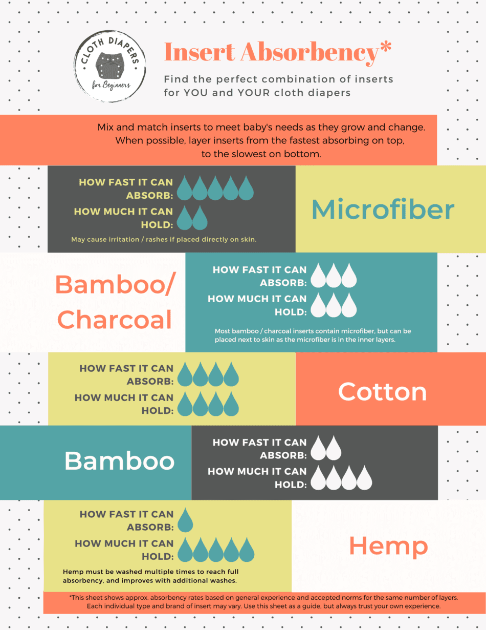 This can be a lot to remember, so I’ve made a little cheat sheet for you to keep handy at your changing spot. It lists the types of inserts in order of absorbency, so when you’re pairing inserts you can just layer them as you see on the sheet — fabrics on the top of the page, go on top of fabrics closer to the bottom.