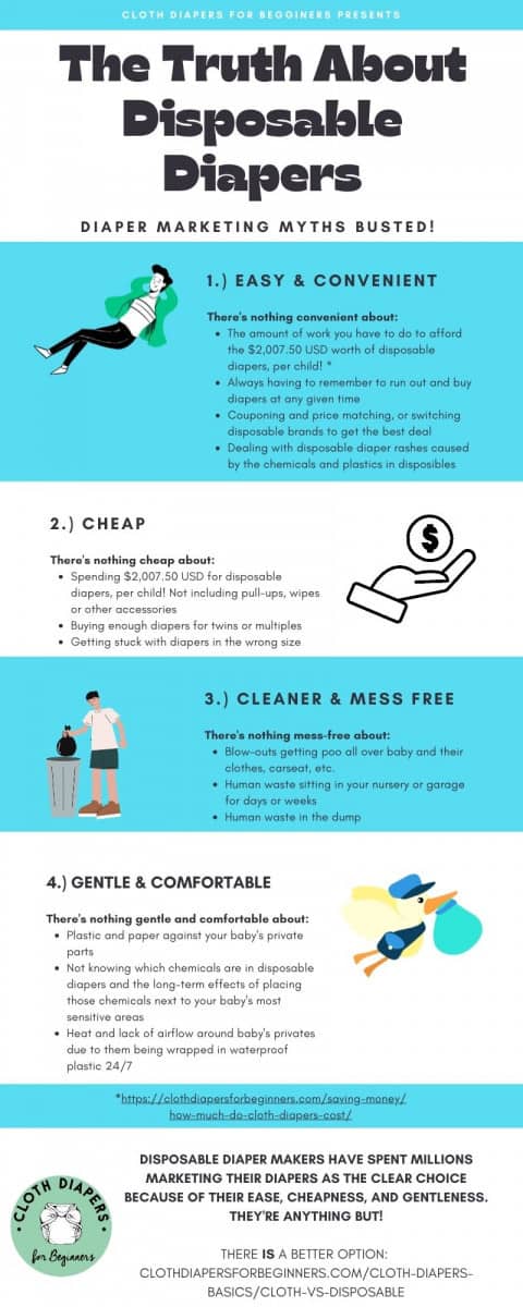 I can’t think of any other feature that a disposable diaper has over what a cloth diaper offers, but I can think of five features of cloth diapers that disposable diapers don’t’: