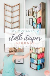 Displaying those cute prints on the wall with a cute and functional shelf is an idea that’s ultra-popular in the cloth diaper community right now. This particular DIY shelf is the current hot storage idea.