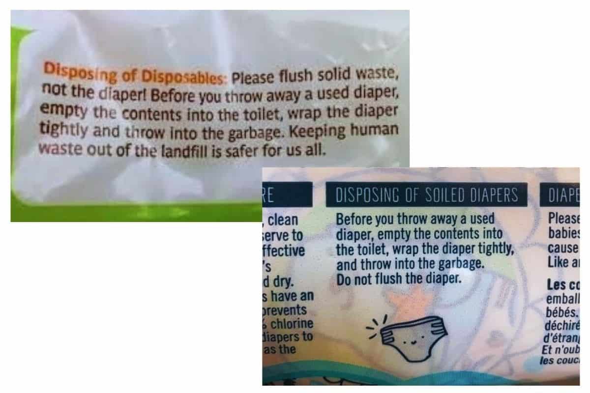 If you’ve never taken a close look at all the fine print on a package of disposable diapers, you may not know that you’re not supposed to toss the poop into the trash along with the diaper. To properly dispose of solids, even in a disposable diaper, you’re supposed to flush them down the toilet.