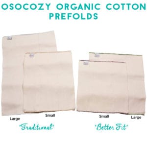 For the typical cotton prefold, I most often recommend OsoCozy prefold diapers. OsoCozy actually has two types of prefolds available: “Traditional” and “Better Fit”.