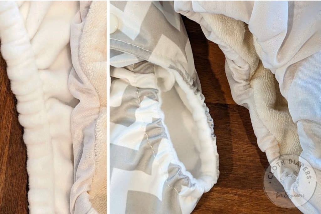 I speak a lot about double gussets in this post here, but basically external double gussets are an extra set of elastics sewn into the PUL side of the diaper (not the lining, as that would be an internal gusset and serves a different purpose).
