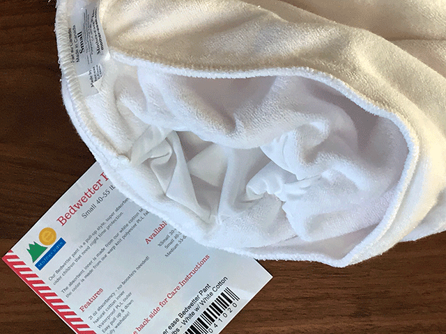 Despite the high price tag, the shocking-at-first poofyness of it, and the very long drying time of the Mother ease bedwetting pant, it’s actually one of the best products I’ve ever owned. These pants are simple, don’t require any preparation or stuffing, stop leaks in their tracks, hold a ridiculous amount of liquid, and hold up to an excessive amount of washing.